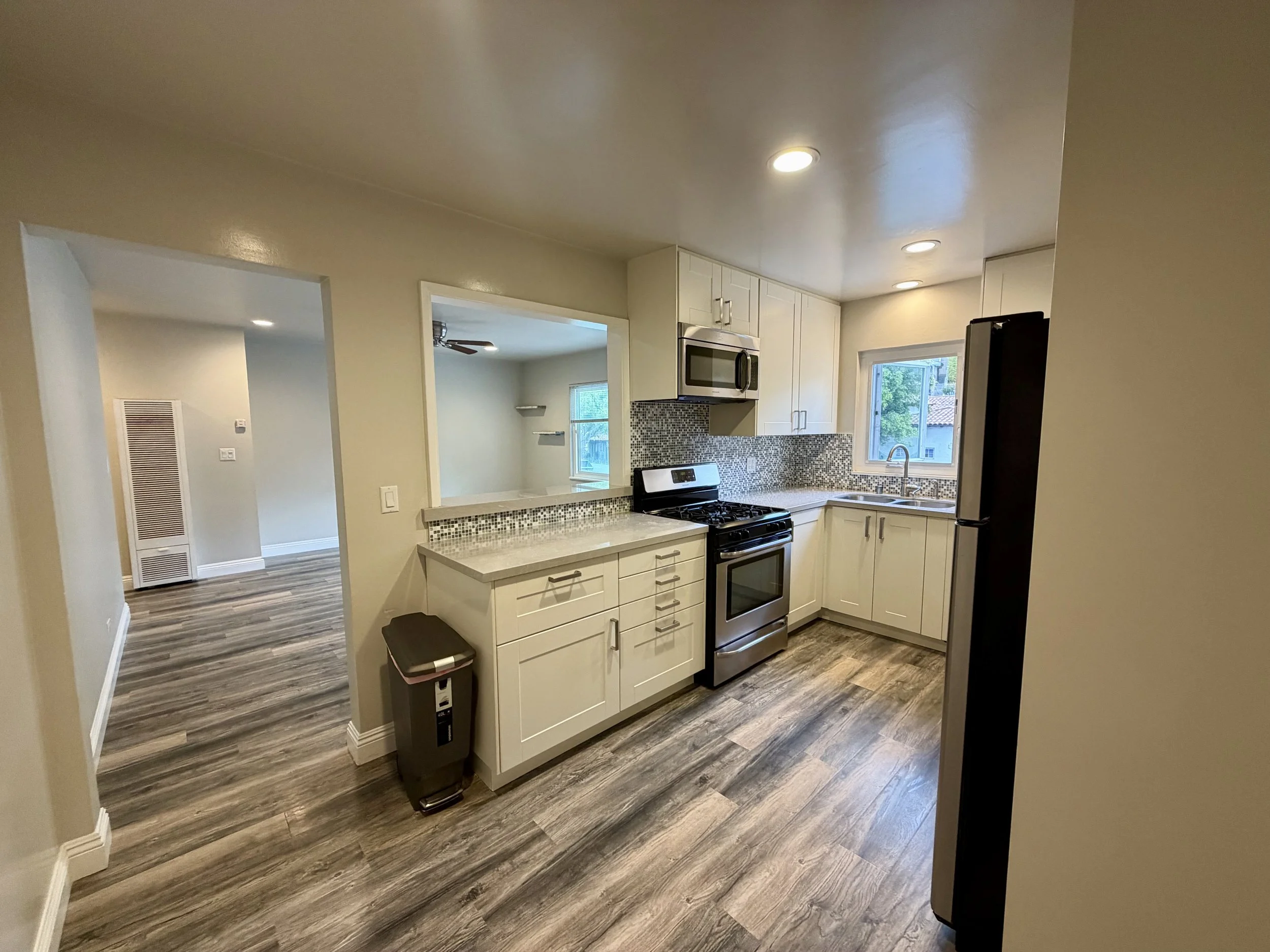 The apartment has been completely remodeled throughout and features new wood laminate and tile flooring, stainless steel appliances with a custom panel dishwasher, quartz countertops in both the kitchen and bathroom, a sleek glass-enclosed shower, recessed LED lighting, and generous storage. A reserved parking space is included and conveniently located directly outside your door.